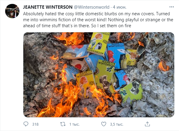 Англійська письменниця Джанет Вінтерсон спалила стос своїх нещодавно перевиданих книг на знак протесту, повідомляє Bird In Flight. Фотографією книг у вогні вона поділилась у твіттері.